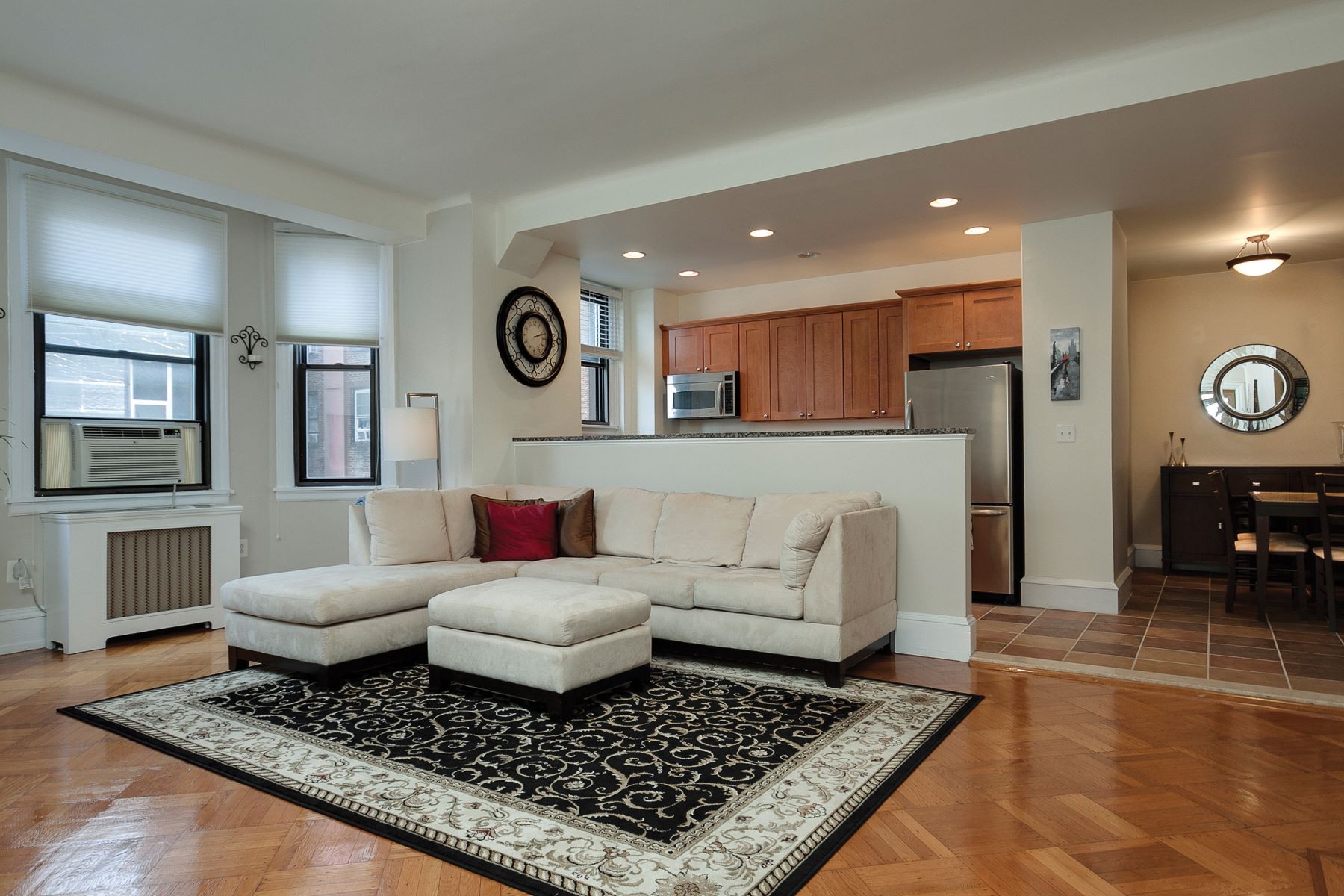 This large corner two-bedroom unit at the Lenox Condominiums was upgraded over the last two years. There is an elegant entry vestibule and it has the highly desirable open floor plan with a great room that includes the living room, kitchen and dining room. The unit has large rooms and high ceilings that give the home a grand look and feel. It is loaded with windows including 3 bay windows that provide great light. The bedrooms are a large scale and each has a walk-in closet outfitted with a professional organizing system. The bathroom was renovated in the last two years, and a full-sized washer & dryer was installed. The kitchen has custom cabinets, granite countertops, ceramic tile flooring and stainless-steel appliances. It has hardwood floors throughout and an original decorative mantle in the living room. As of last year, the Lenox allows owners to install central air or split systems, and approximately a dozen owners have installed them thus far. The Lenox is a pre-war building designed by famed New York architects Clinton and Russell. It was built in 1920 and renovated into condos in 2004-5. The units have large scale rooms, high ceilings, lots of windows and most units have their original architectural elements. It is a doorman building and is centrally located at the southern end of Mid-town Village in Washington Square West. It is two blocks from the great shops, restaurants, theaters, Kimmel Center and night life of Midtown Village, Walnut Street and the Avenue of the Arts. It is also just a few blocks from Thomas Jefferson and Pennsylvania Hospitals. There are many public transportation options within 1-4 blocks. Reading Terminal Market is just a 10-minute walk away. The condominium provides 24-hour door staff, heat, water and high-speed internet. Owners pay their own electric, Cable or Dish TV and cooking gas, where available. There is additional building storage available and many local parking and gym options. The Lenox is pet friendly, but there are size and exotic animal restrictions.