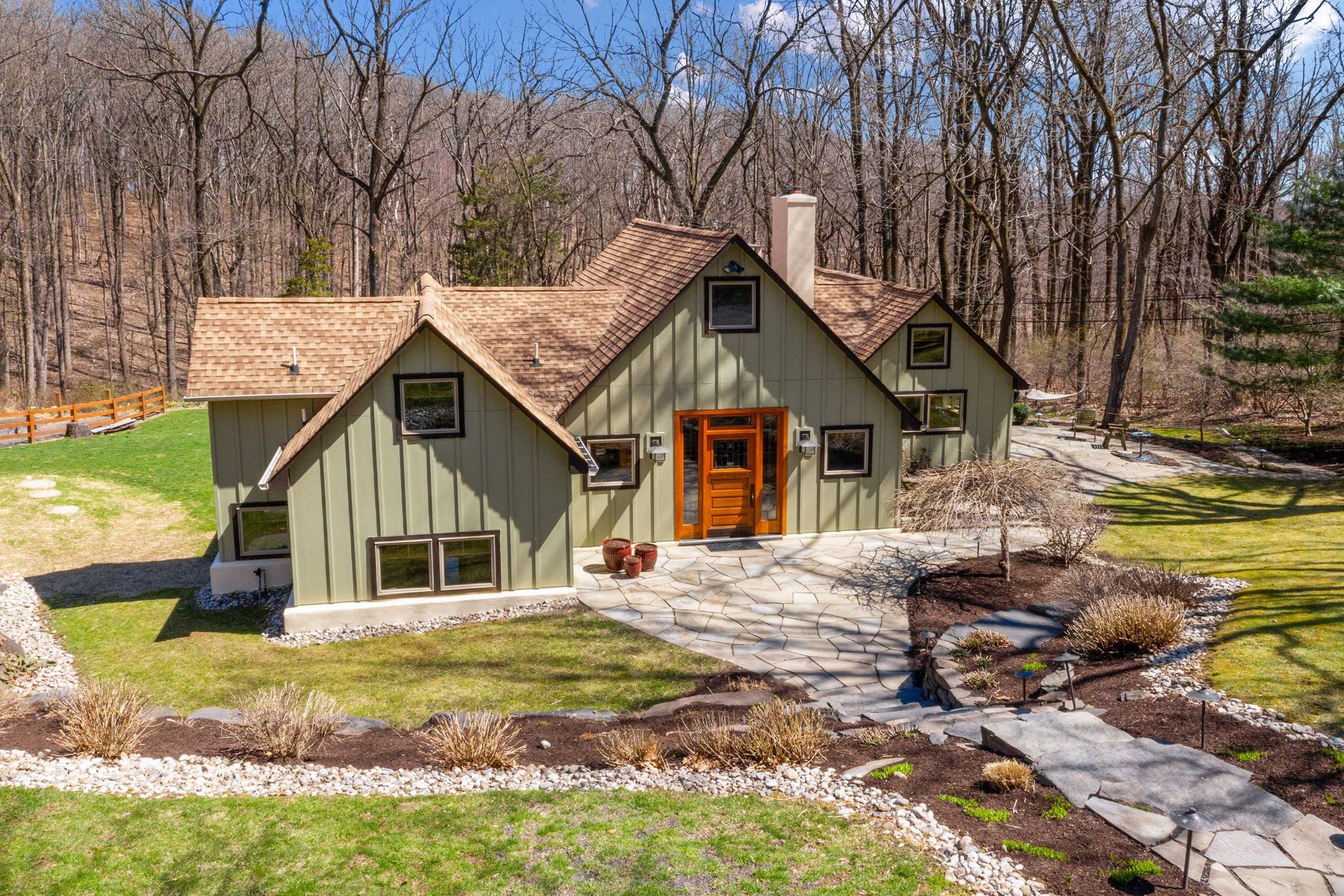 Nestled a half mile up a private gravel lane in the quiet woods atop Buckwampum Mountain is this 3 BR, 2.1 bath Cape-style retreat. Adjacent to 174 acres of Bucks County open space park, this 5-acre property offers fantastic privacy and serenity. Granite steps, stacked stone walls and flagstone patios create wonderful outdoor spaces. The open concept interior presents an organic ambiance that rivals its natural environs. Rich cypress wood graces the floors, custom doors and woodwork throughout. The heart of the home is the light-filled great room with custom cabinets, stone fireplace, and beamed vaulted ceiling with cable lighting. French doors open to a flagstone patio with outdoor fireplace, bringing the outdoors in with views of the wooded ravine. The stainless and granite eat-in kitchen offers a Wolf LP range, hickory cabinets and decorative tile floor. The unexpected cozy loft above is perfect for an afternoon siesta or extra weekend guests. The dining room with vaulted ceiling and second stone fireplace is open to the kitchen and flows to the large deck overlooking the grounds and wooded landscape, ideal for al fresco dining. The main bedroom opens to another flagstone patio, and the en suite has heated slate tile floor, glass shower, whirlpool tub and heated Toto toilet. The dressing room with two closets also fits a Peloton bike. Upstairs are two adorable bedrooms and the tiled hall bathroom with stall shower and Toto toilet. The basement has 10’ ceiling height and offers 980sf for workshop, storage or additional living space. Efficient multi-zone LP hot water radiant and baseboard heat plus central AC. Amish-built outbuildings include a 2-stall shed with fencing, garden shed with dog run, and chicken coop.