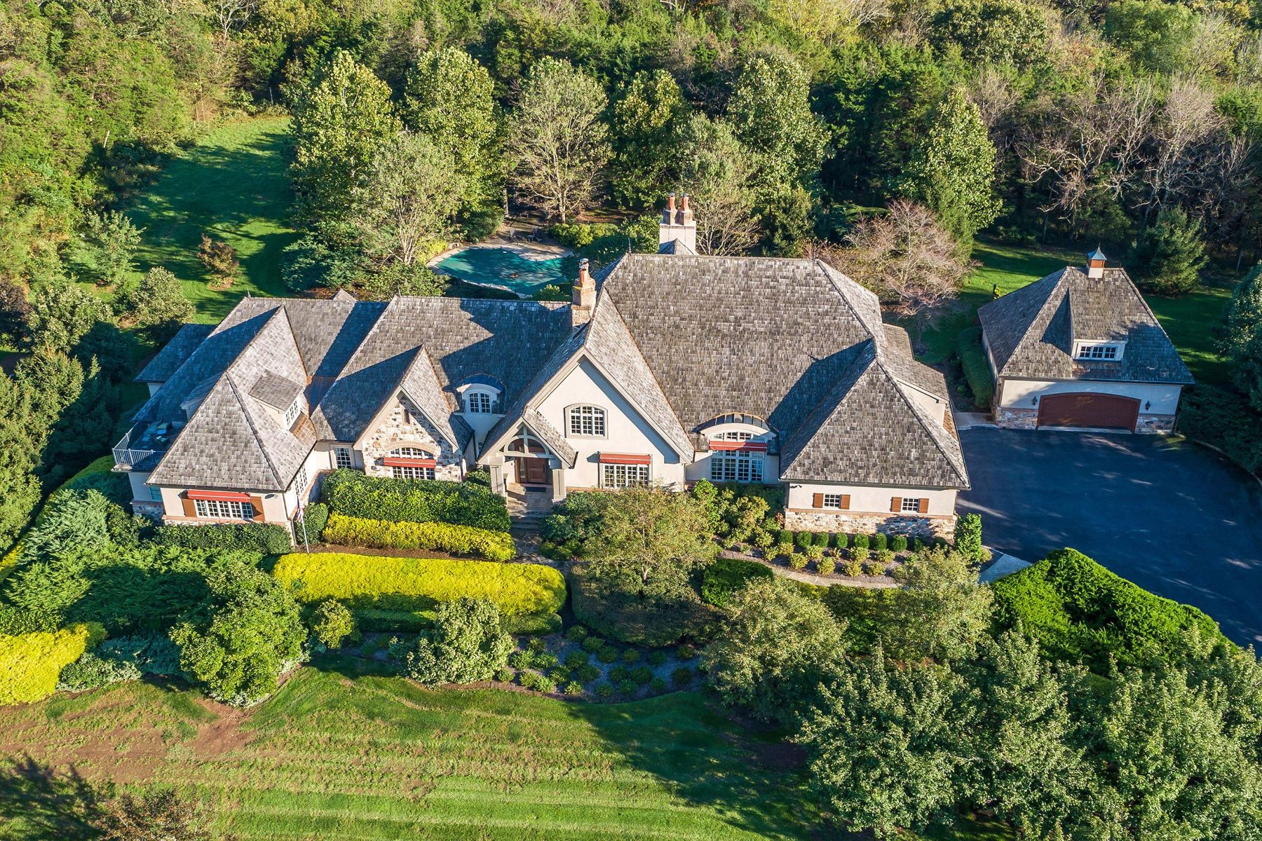In a prime area of Tinicum Township, a long winding gated driveway leads to this magnificent custom-built home, situated on a private 30.5-acre property. Affording breathtaking views of scenic rolling countryside, this exquisite home is situated at the top of this secluded hillside property. Quality craftsmanship and impeccable attention to detail are found throughout this sprawling 4 Bedroom, 4.1 bath stone-fronted French style home. It is beautifully finished with gleaming wood floors, 10 ft. first floor ceiling height, abundant windows and French doors, custom millwork, moldings, built-ins and wide thresholds, generous room dimensions, 2 fireplaces, and a first-floor main bedroom wing. The inviting entrance foyer with tall windows leads in one direction to the formal living areas, including a living room with brick fireplace, coffered ceiling and wall of windows, gracious dining room, and gourmet chef’s kitchen with adjacent breakfast room nearby. The expansive kitchen is outfitted with an oversized center island with bar stools, granite counters, custom cabinetry, stainless appliances including a 6-burner Wolf cooktop with two warming drawers, stainless convection microwave and wall oven, and walk-in Butler’s Pantry. The wonderful family room opens to the kitchen, great for gathering and enjoyment of the stone wood fireplace. Nearby is a home office and full bath, laundry and access to the 2-car attached garage. The opposite end of the home is finished with a handsome library and cozy study, theater room, and the private main bedroom suite, allowing for one-level living. The spacious main bedroom with two sitting rooms, also is enhanced with a full marble bath with soaking tub, large shower & radiant heated floors, along with a large walk-in closet & convenient 2nd laundry. Two staircases access 2nd floor quarters with carpeted floors- in one section are two bedrooms & a full bath, and in the other, a 2-room suite with balcony and full bath. The spacious attic and part-daylight basement areas offer tall ceilings and plenty of storage. Outside, there is an inviting covered patio, in-ground pool & gazebo, detached 2-car garage with guest bedroom & convenience bath above, and a large equipment/machine storage building. Additional features include an extensive security system, deer fencing, solar panels, and an alternative pellet heating system. The property is protected under a deed of conservation easement with the Tinicum Conservancy. For full time or country/weekend residents, come enjoy the total privacy yet convenient location this very special property offers in a premium part of beautiful Bucks County!