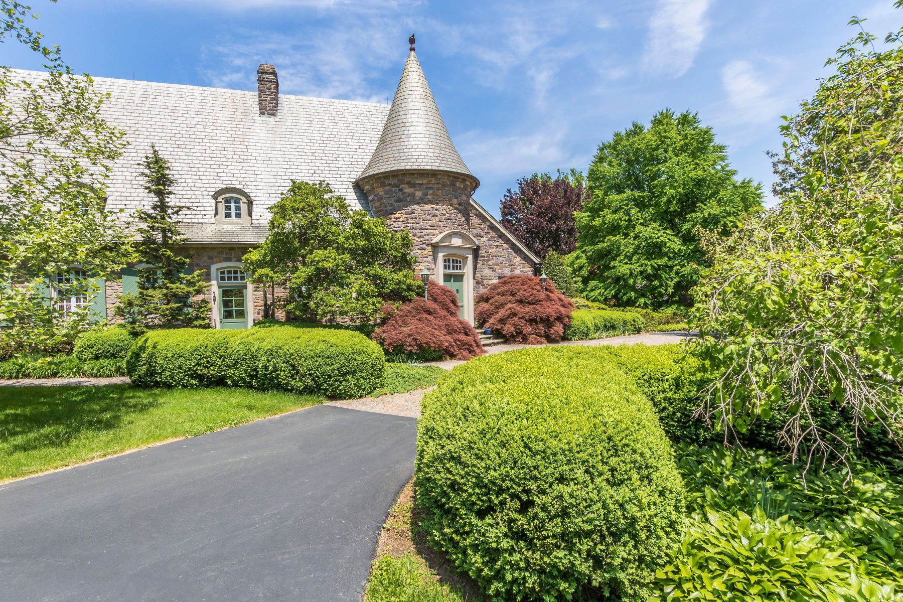 A rarity in Solebury Township, this hidden estate residence with pool on 16 acres was designed in 1950 by two architects to resemble a castle in Belgium, the original owner’s home country. Beautifully proportioned rooms with excellent flow for entertaining make it feel more Main Line than Bucks County, but make no mistake, this private setting near the village of Carversville is pure Solebury with arboretum-like grounds and ever-blooming gardens. Its circular, domed main entry leads to a wide, gallery-style hall. From here, access all first-floor living spaces. A dramatic main salon with fireplace and five sets of French doors opens to a full-length terrace. The formal dining area, warmed by a woodstove/fireplace, can accommodate multiple seating arrangements and opens to the rear terrace. Adjacent is the expansive kitchen with island and casual dining area. A service entrance with laundry and storage is convenient to this workspace. On one end of the home, its library/study lined in built-ins feels like the reading room at a private club and opens to a sunroom. Also on the first floor is an owner’s suite with sitting room, sleeping quarters and his and her baths as well as three walk-in closets. High ceilings, substantial moldings, pristine Mercer floor tile, handwrought hardware and hinges on doors and other details add to the home’s appeal. Private quarters upstairs offer spacious accommodations with five additional bedrooms and three full bathrooms. Gardens laced with walking paths lead to an oversized in-ground pool complete with diving rock, gazebo and pool house. A carriage-house style garage for three cars, including a wash bay, has a nicely appointed one-bedroom apartment above. Previously owned by a botanist, the property showcases spectacular gardens with a generous amount of level lawn ready for a croquet match. As a Bucks County retreat from the city, “The Castle” works as well today as it did 70 years ago when its first owners used it as an escape from Philadelphia. It is a one-of-a-kind offering for our area.