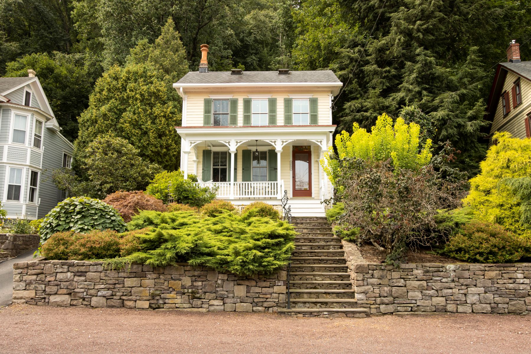 Discover this circa 1855 classic Bucks County river house, meticulously restored and upgraded with extensions and modern amenities under the care of its current owners. From the custom-made wrought iron handrails and stained-glass window from local artisans to the impeccably refinished hardwood floors throughout, you can’t help but appreciate the attention to detail in this home. Upon entry, you are greeted by an abundance of natural light and welcoming spaces. The living room has custom built-ins and a glass-front gas fireplace for cozy evenings. The totally remodeled and upgraded kitchen offers stainless steel appliances, LG refrigerator, ASKO washer & dryer conveniently hidden by custom cabinets, leathered black granite counter tops and a marble & iron table for extra workspace and casual dining. The beamed-ceiling dining room is perfect for everyday use as well as formal entertaining with a stone and mantled propane-fueled fireplace for ambiance and a wall of windows with sliding glass doors to the patio. A half bath with live-edge granite counter finishes the first floor. Upstairs you’ll find the spacious master bedroom extension with reclaimed pine floors, vaulted ceiling & a generous bank of windows showcasing the unobstructed view of lush greenery to the rear of the property. A second bedroom and a flex room accented with ship-lap walls could serve as another bedroom, office, or studio are both down the hall. The full bath has been remodeled with Carrara marble tiles, glass shower, and soapstone counter. The finished attic space, with skylights and wooden ceiling, could easily lend itself to a reading nook, playroom, or bonus storage space. Enjoy partial river views from the lovely, covered front and side porches. Or relax in the exquisitely landscaped very private back yard – abundant with perennials, stone retaining walls, fireplace, patio, and Zen Garden with soothing fountain. Convenient to everything. Walk to the Black Bass Hotel, the 1740 house, and the Lumberville General Store, as well as the foot bridge spanning the Delaware River, or the Delaware & Raritan Canal towpath – for walking, jogging, biking, and kayaking. Just minutes from the shops, entertainment and the cultural events that both Lambertville & New Hope have to offer. A must see!